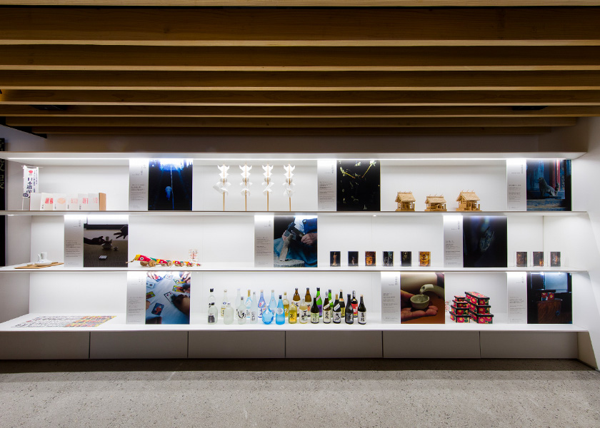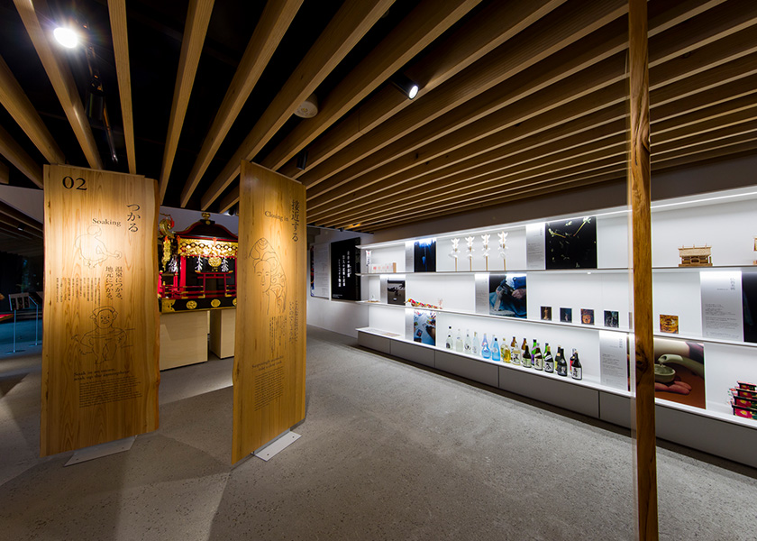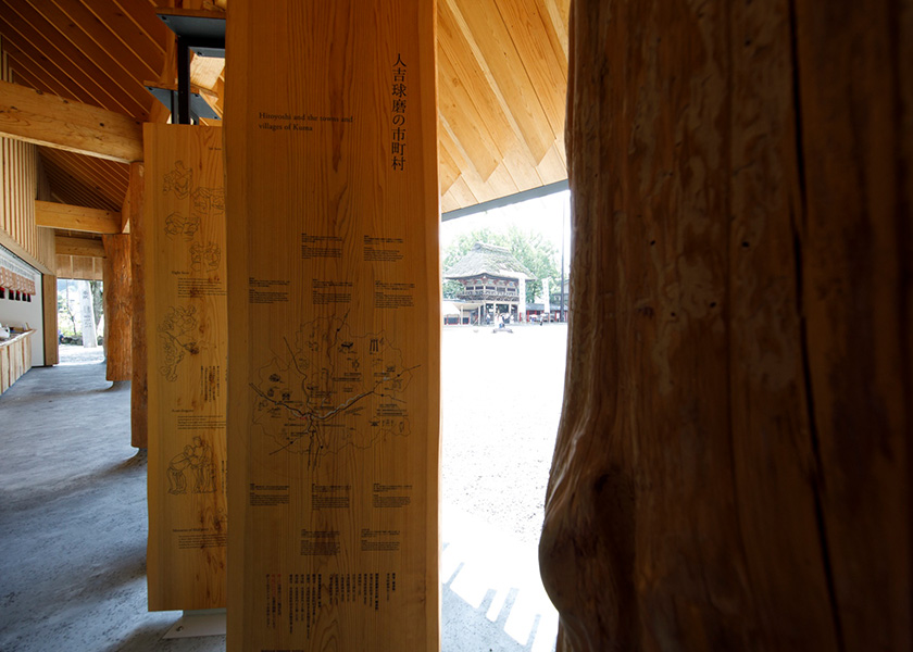 1 階拝観室のエントランスでは、木目美しい市房杉を使い人吉球磨の魅力を紹介すると共に、きじ馬や花手箱などの伝統工芸品や球磨焼酎を展示しています。